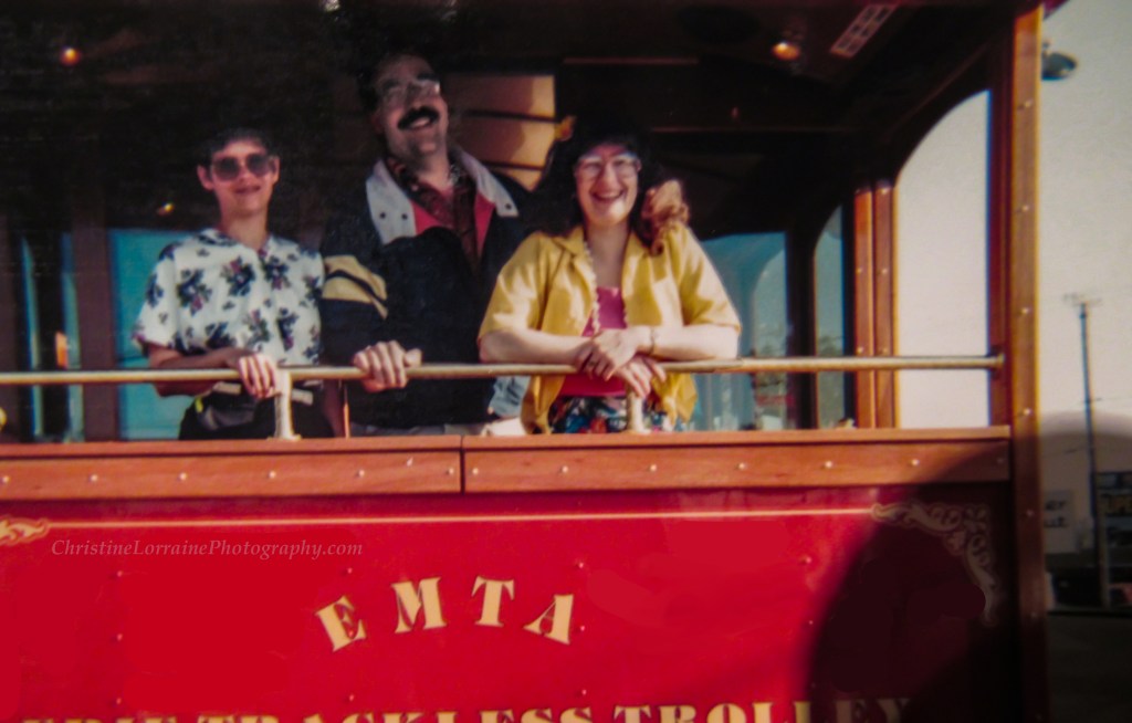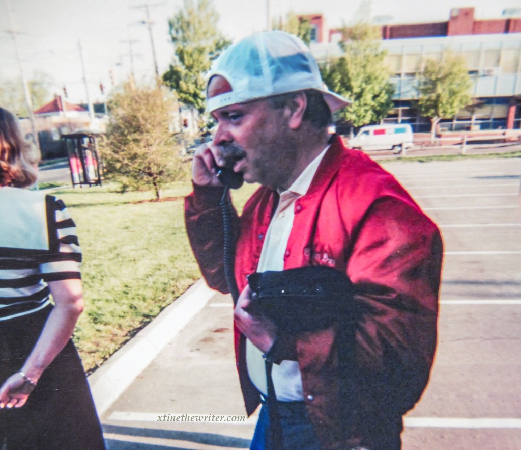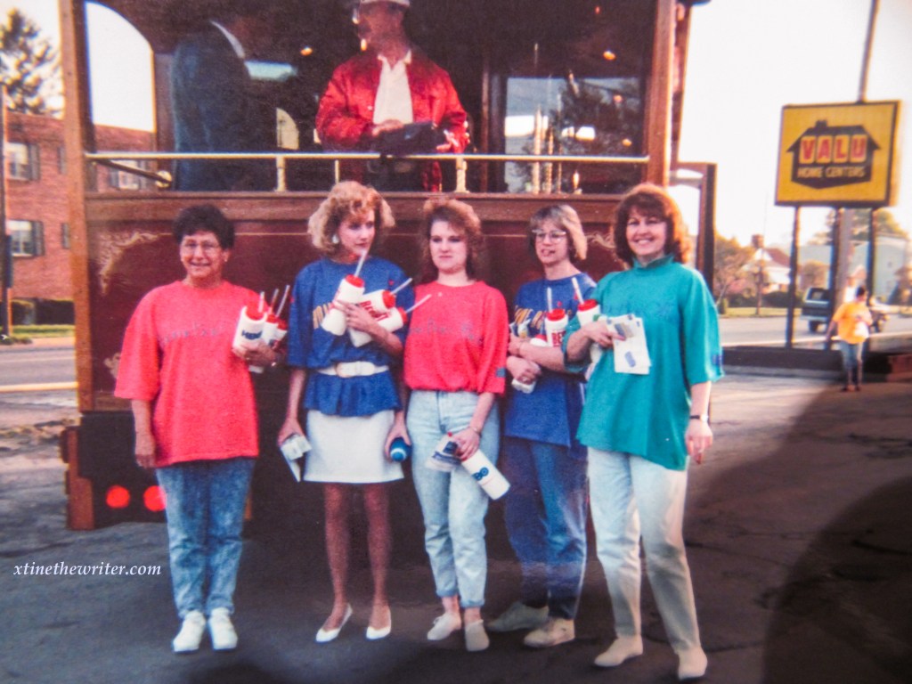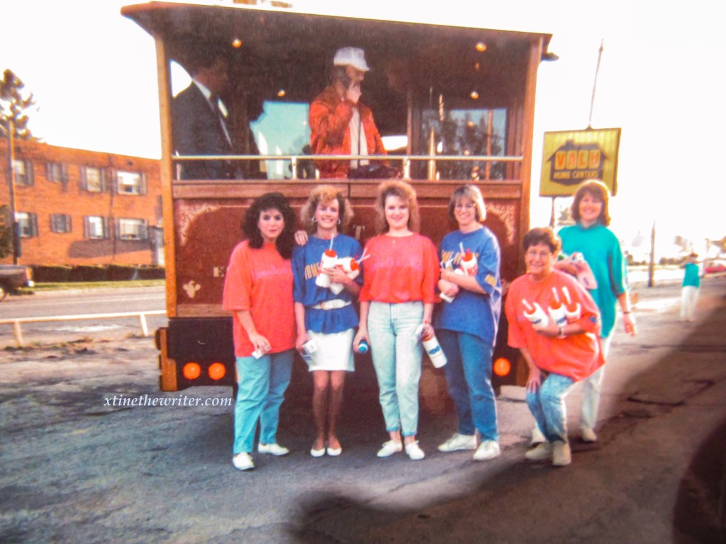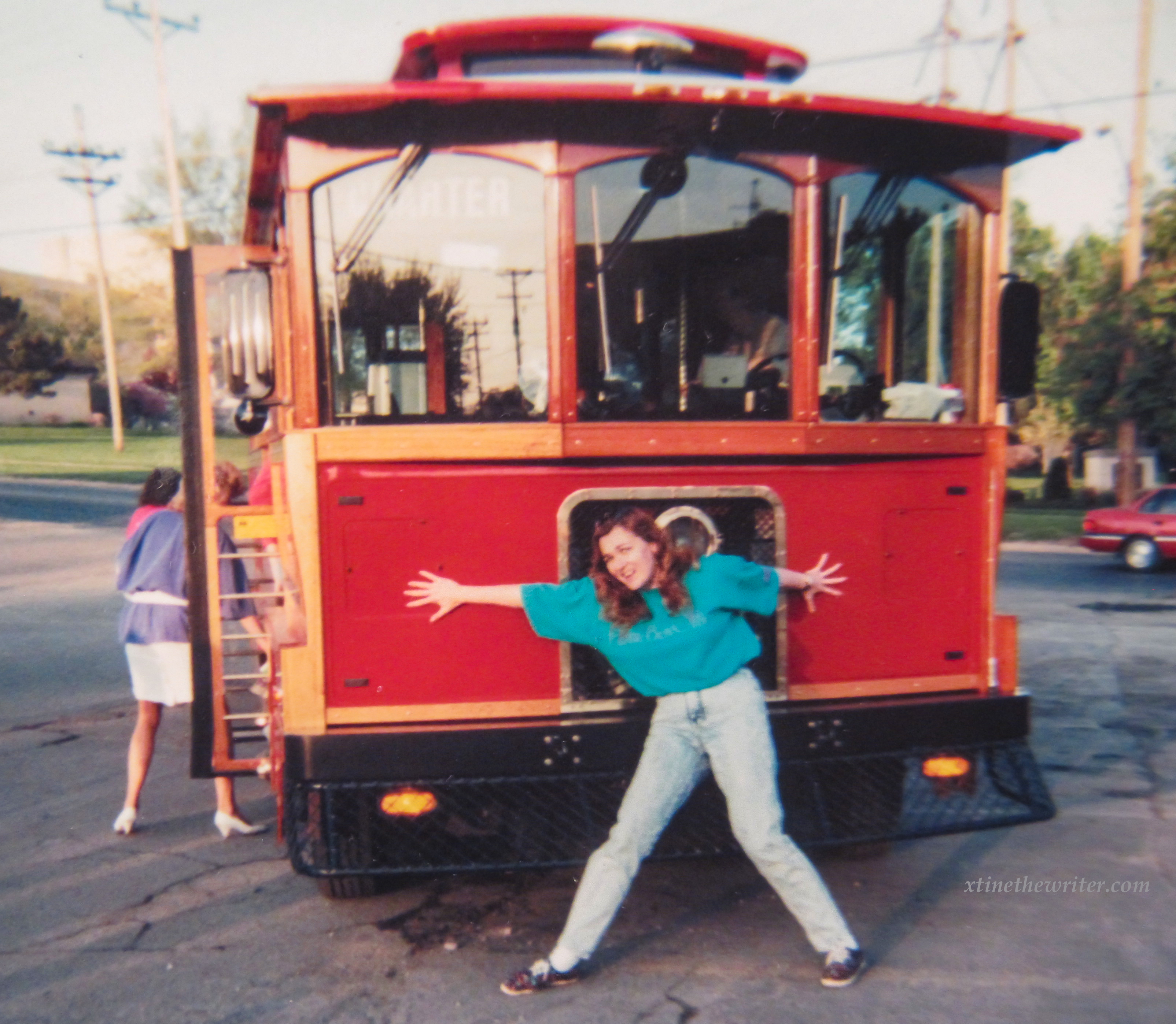 Kris, Rochelle, Rita, Corey, unknown, unknown and Rose pose for a picture on the EMTA Trolley (from left)Rose, Corey, Rochelle, Peggy and Kris carry water bottles while Erie radio personality Captain Dan Geary stands on the back of the EMTA trolley.Caught in a silly pose, pretending to stop the trolley’s progress is none other than the author, xtinethewriter, aka Christine Lorraine Morgan, who worked for Erie Cablevision from 1991-1996. She also started her TV production/Video editing career at the 9th & Peach Street location as a public access user, where she produced and aired dozens of original shows on the local cable channel until it was made obsolete in 1992.Captain Dan Geary is seen here at the Cablevision event talking on a wireless phone back in 1993, long before cell phones became commonplace.These unidentified folks were also there on the EMTA trolley for this Erie Cablevision event in 1993.