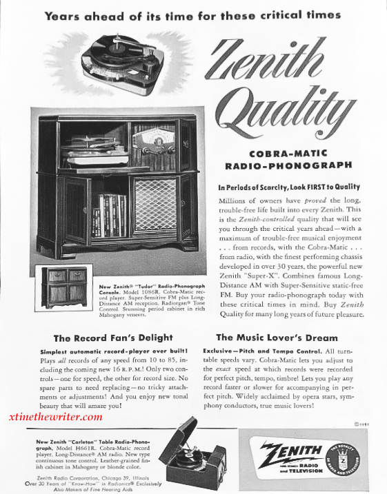 Imagine how refined this Zenith Cobra-Matic radio phonograph looked in the parlor back in 1951. This relic of mid-20th century audio technology looks new and ready to play a stack of records. It was so high-tech that according to the Cobra-Matic advertisement below the photo, it was ready to handle the “coming new 16 R.P.M.”