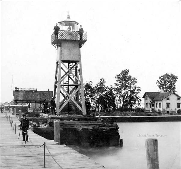 The iron structure housing the beacon is still in use today, although it has been enclosed and moved to a different spot. This photo is about 100 years old, showing what the lighthouse looked like when it was open and the spiral staircase was visible.Here is what that same lighthouse looks like now. It it still in use at Erie Harbor.