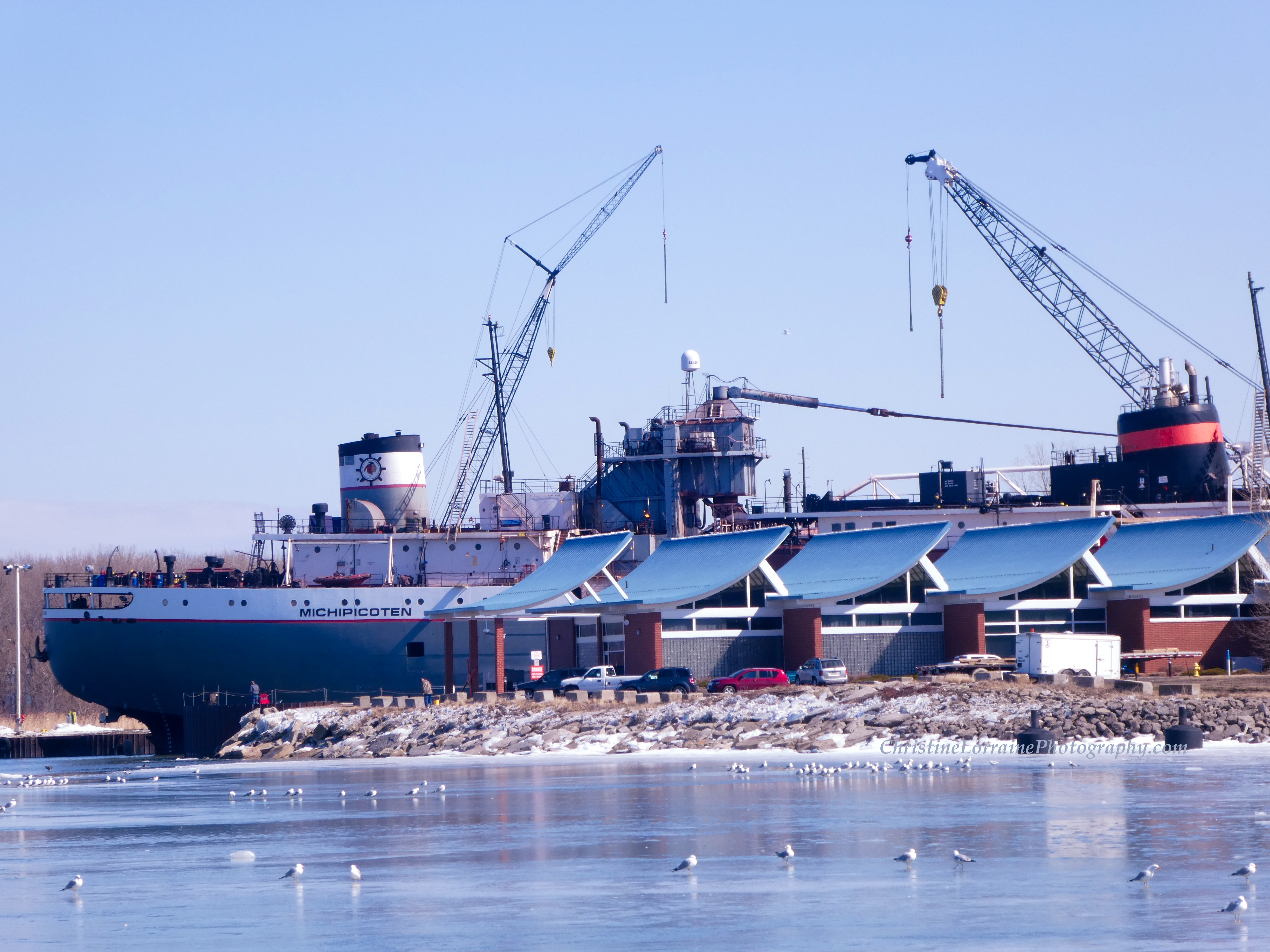 The Michipicoten dwarfs the cars parked next to it on the east side of Erie, PA’s downtown bayfront area.