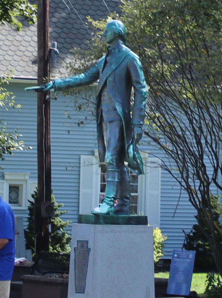 Background-wise, in December 1753, Washington arrived in the Waterford/Fort LeBeouf area with notice from the governor of Virginia to the French that they were trespassing on British soil. The statue depicts his arm extended, holding his all-important message to the French.
