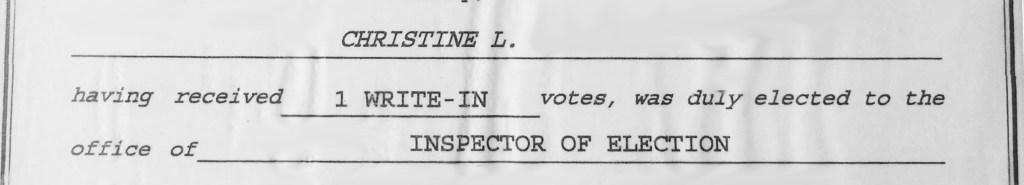 Weeks passed, and one gray, snowy December afternoon a curious letter arrived in the mail. It was from the local Board of Elections, and it declared that I was tied with three other candidates for some odd post that I had not heard of before, “Inspector of Elections – Majority.”