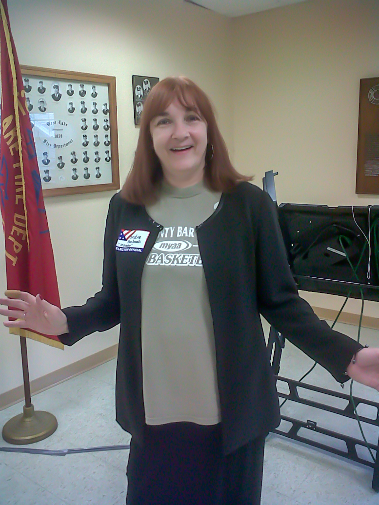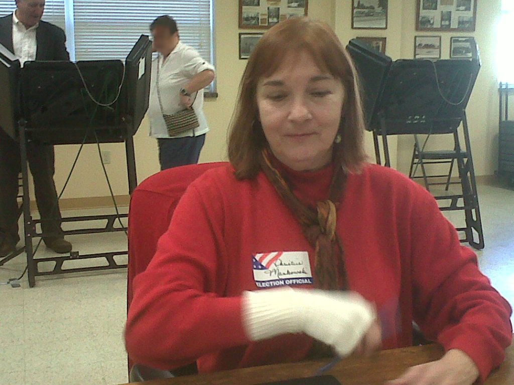 Author Christine Lorraine Morgan poses at the precinct where she enjoyed serving as Majority Inspector of Elections for four years after inadvertently electing herself with a write-in vote.