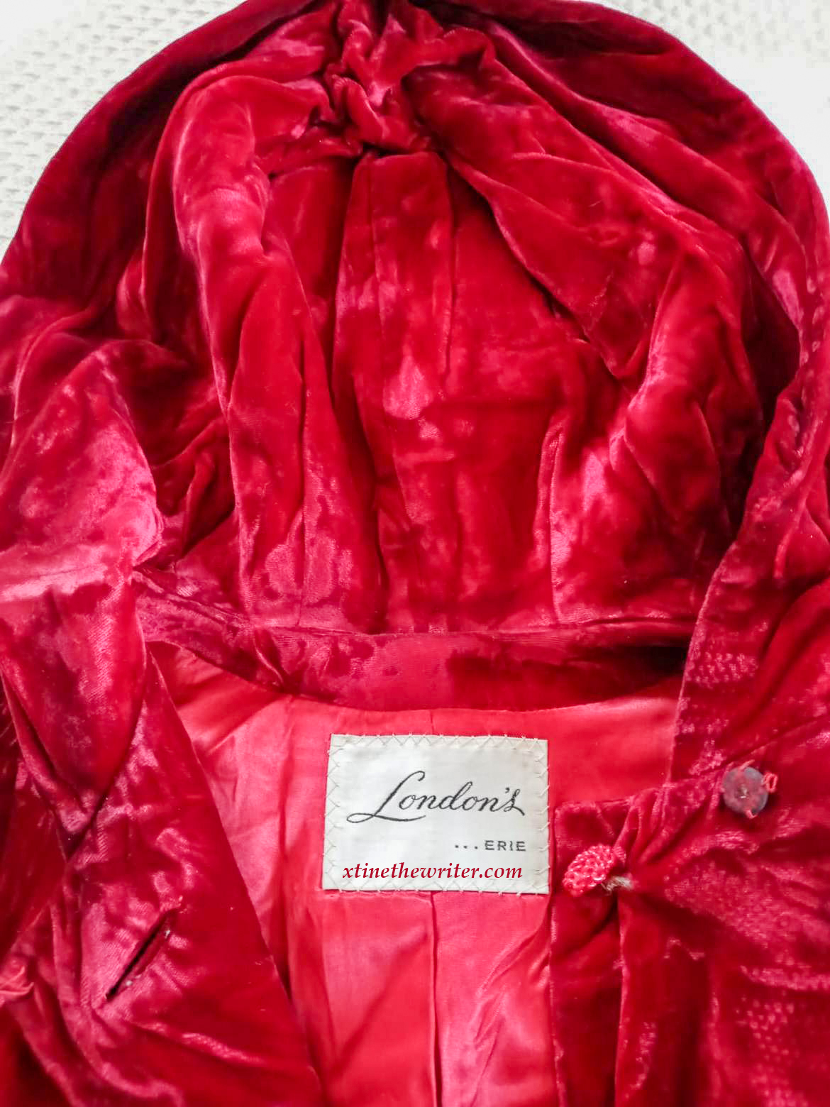 This full-length red velvet hooded cape was purchased at “London’s … Erie,” and from the looks of it, the garment was most likely produced and sold in the early 20th century.