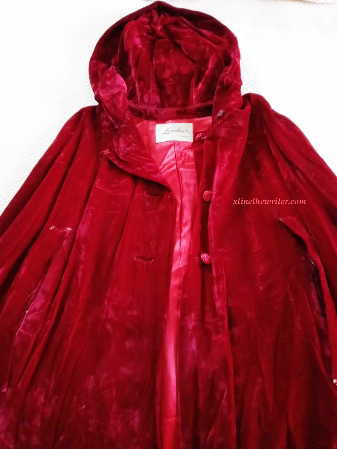 Discovered this gorgeous red velvet hooded cape in a thrift store hanging all by its lonesome in a 1980s thrift store, and have treasured it ever since.