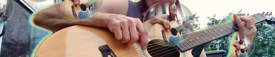 In her leisure time, Xtine relaxes by picking bass lines on her acoustic guitar. That is, until her beloved border collie Zoey sees someone walk by and starts barking in a most unrelaxing way. Thus this improv song, “My Dog is a Barking Bitch Blues,” was born in an instant on the “front deck” as people walked by and Zoey decided to chime in and spawn a blues song.
