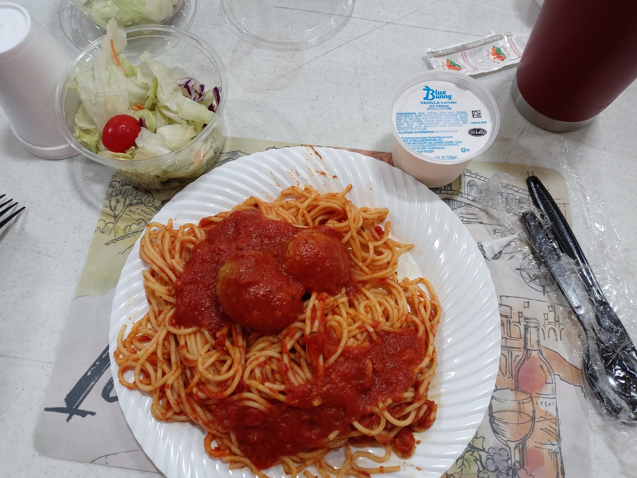 Spaghetti with meatballs, fresh salad, delicious Italian bread and an ice cream cup are a perfect combination.