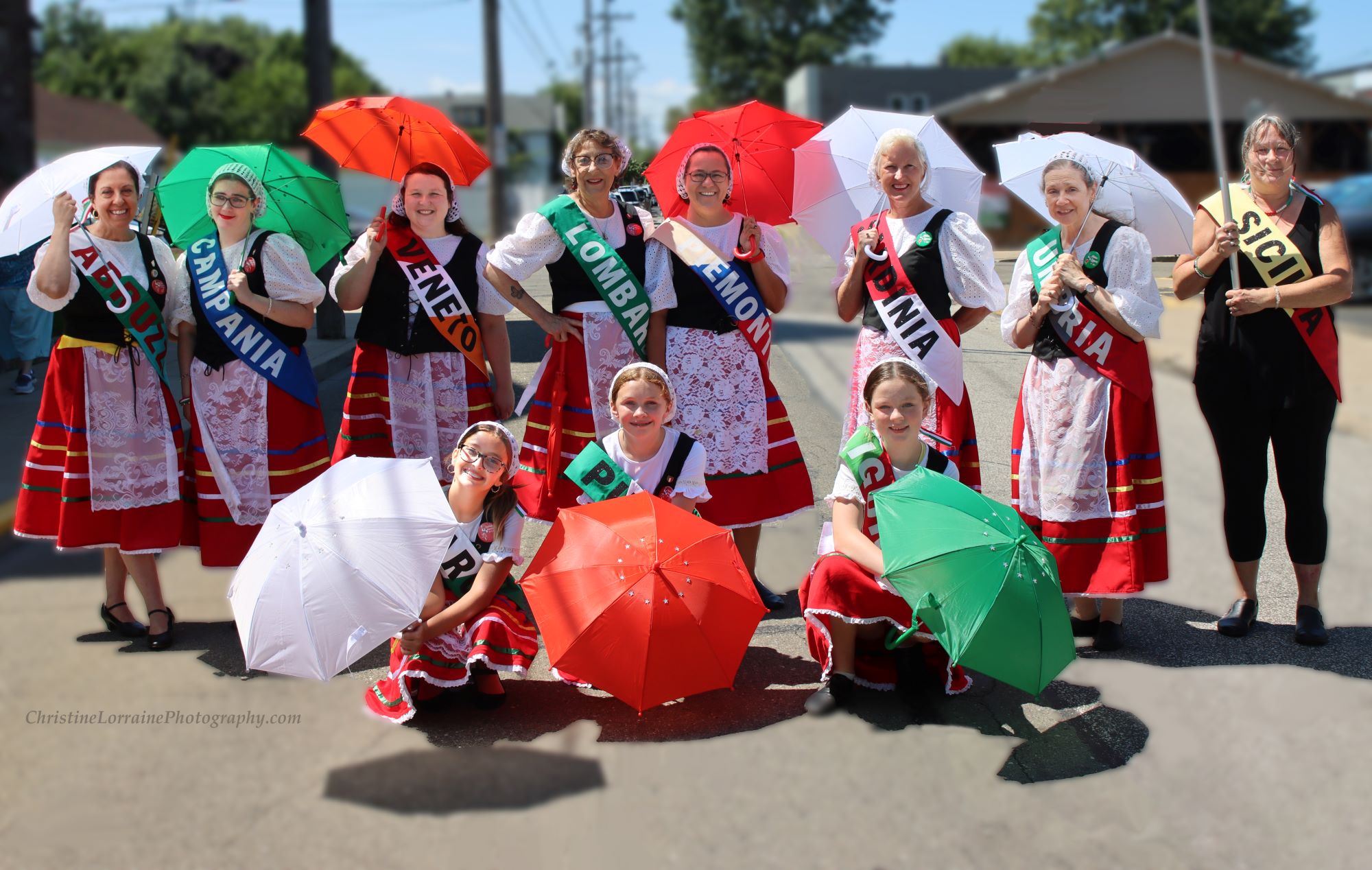 Lined up and ready to go, the Italian Dancers of Erie carried red, white and green umbrellas this year to keep them safe from the sun and to splash extra colors around.