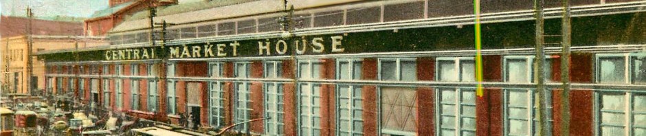 This 1913 postcard depicts a bustling marketplace, where a multitude of merchants gather to serve the public by selling bread, milk, fresh produce, meats, fish and many other items. Pretty sure the sign in the lower center next to the trolley reads: L. Loesch, wholesale Fish & Cheese.