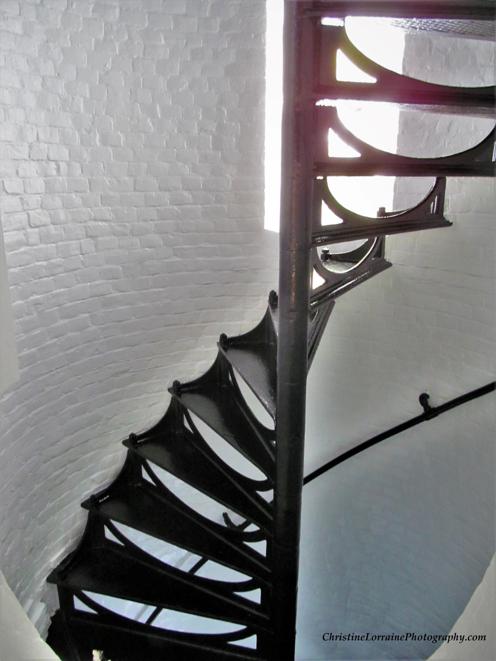 Here’s an inside view of the round stairwell with a stunning metal spiral staircase, even though the tower is square.