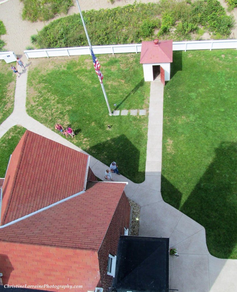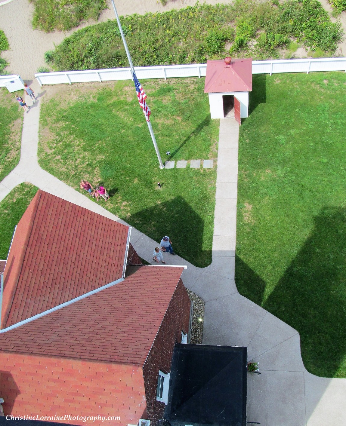 The lighthouse tower’s shadow is visible in this photo from the very top.