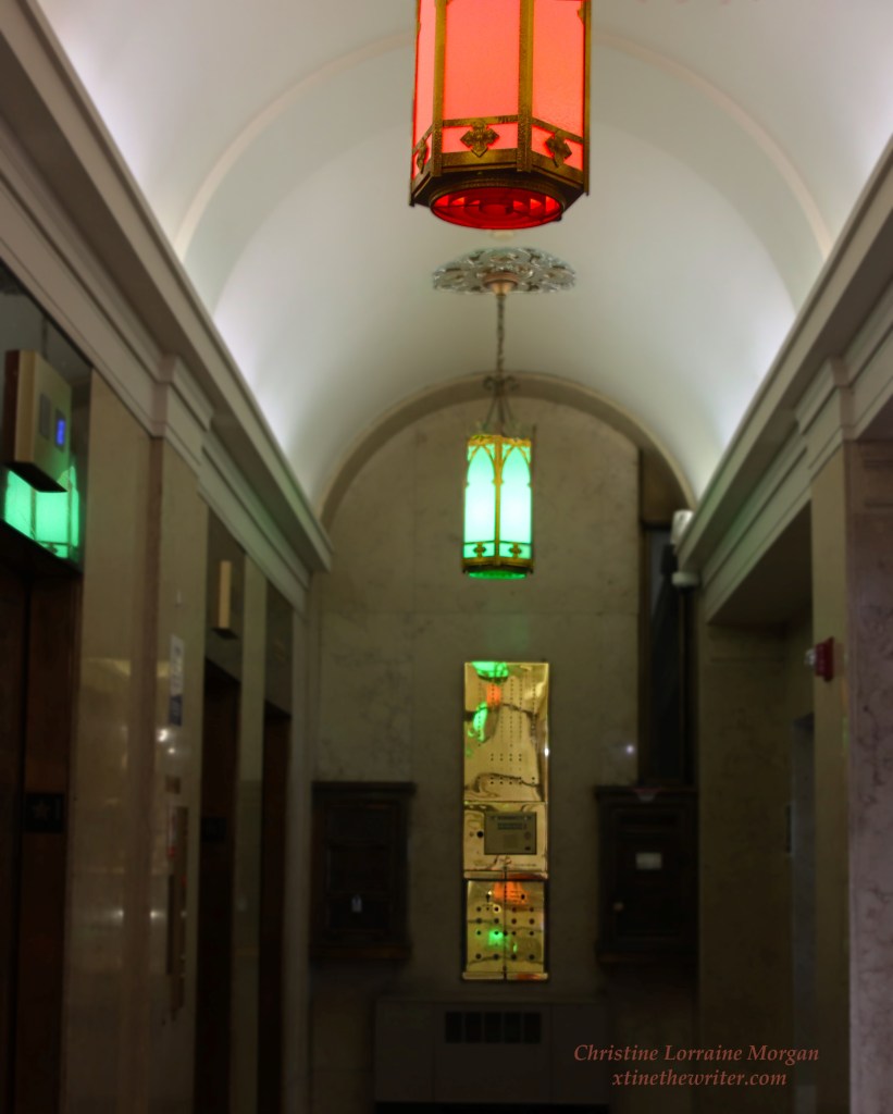 The red and green lights play colorful games with the shiny brass piece at the end of the hallway where the elevators are located in the Renaissance Centre.