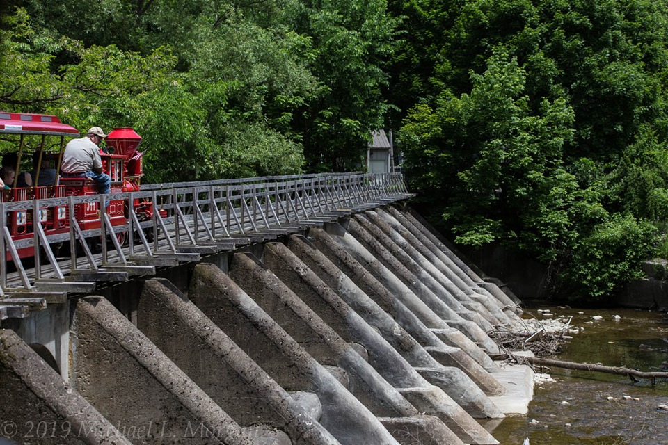 “The bridge, which also serves as a driftcatcher to prevent further flooding, was constructed in 1916, and updated in 2010. It was adapted for use as a mini-train trestle in the mid 20th century,” according to https://trainumentary.com/2019/06/25/watch-the-erie-zoo-train-cross-a-103-year-old-trestle-twice-on-trainmentary-17/