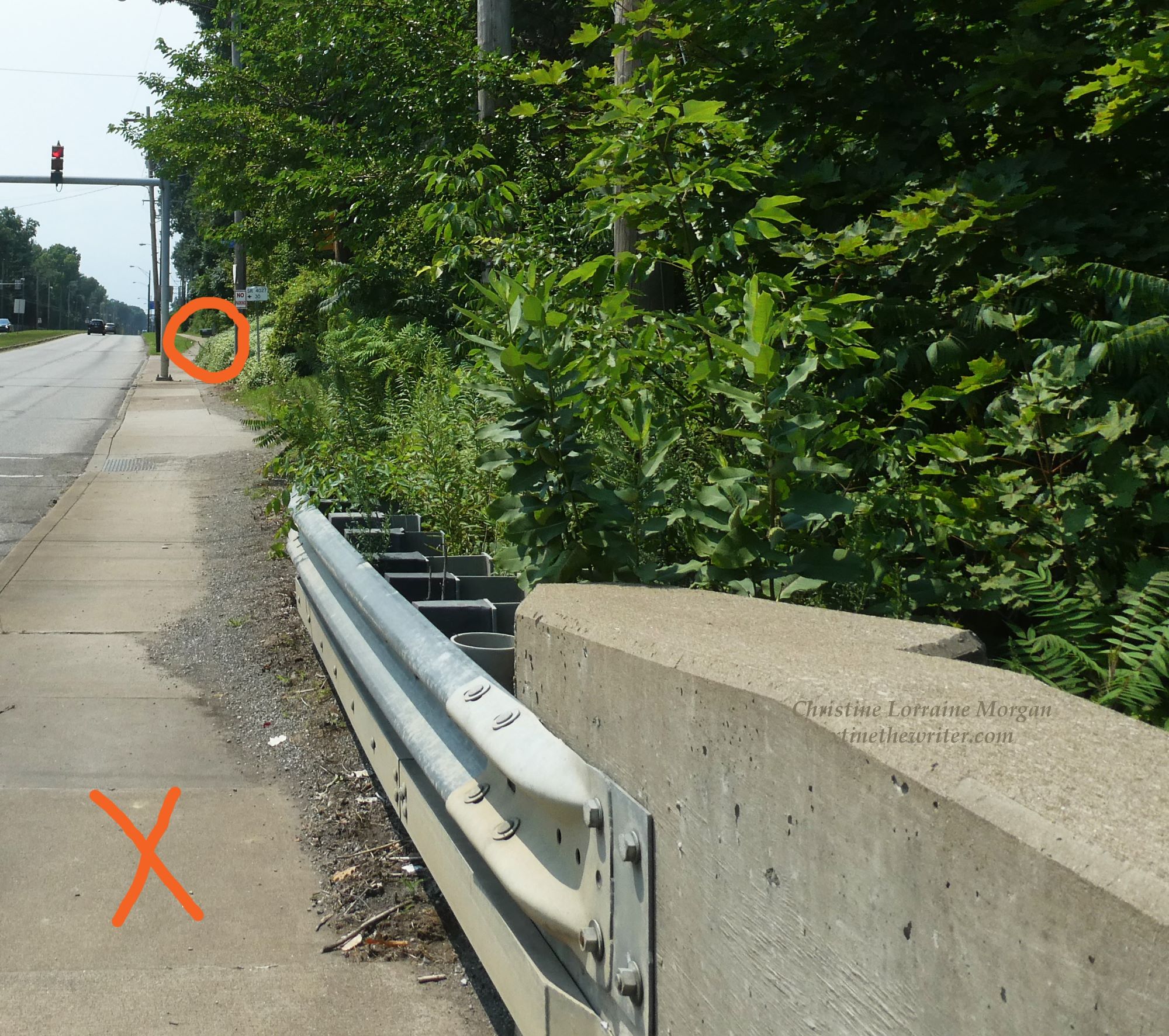 “X” marks where I stood when photographing the creek (to my right). “O” encircles the mailbox for the Crowley House to show proximity.