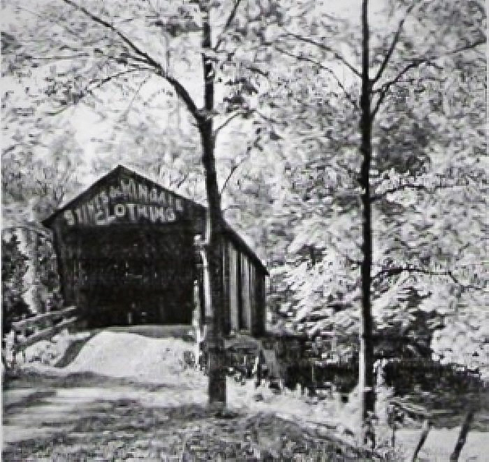 Here is the front view of the Carmen/Perry/Van Camp covered bridge. Back then, there was no TV or radio or internet for advertising, so covered bridges were sometimes used for local businesses to place ads. Image is courtesy of the Albion Public Library.