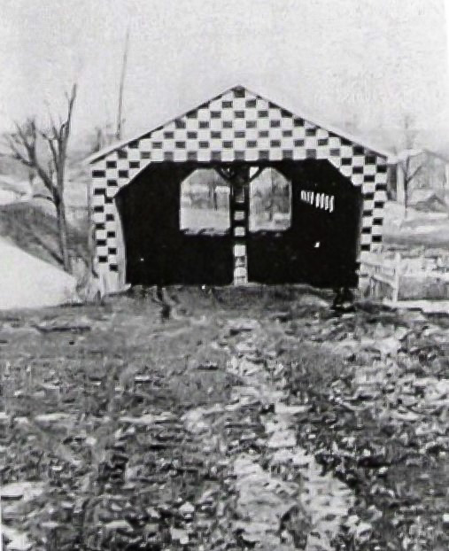 Presenting the Cherry Hill covered bridge. Just wish I could have seen this bridge ~ never saw one like it before with its checkered design. The road sure looks muddy in this photo. Image is courtesy of the Albion Public Library.
