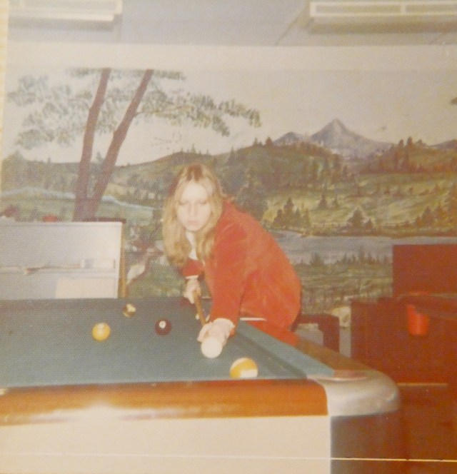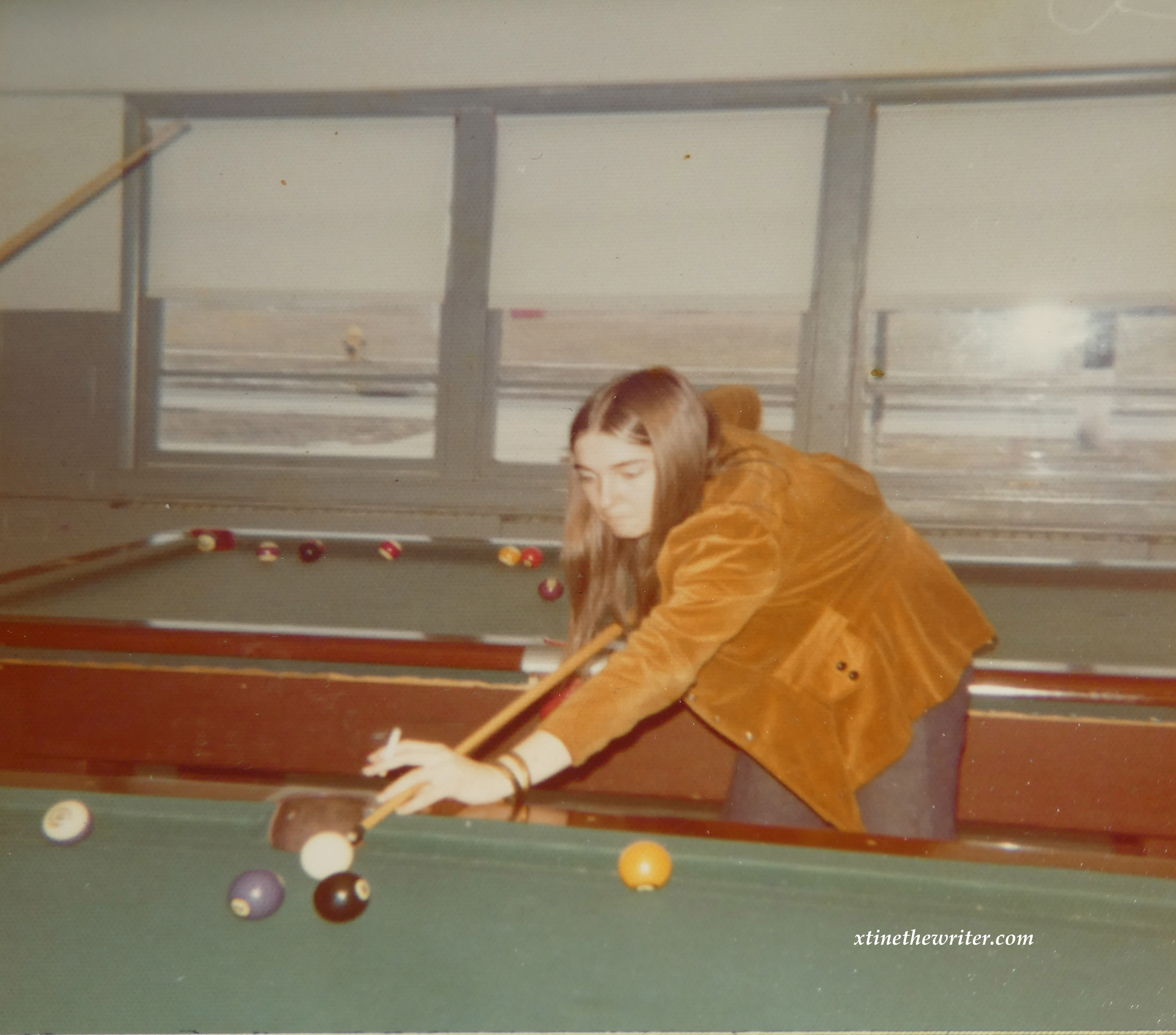 Here, Christine attempts to shoot pool with a cue without a tip, while holding a Kool cigarette and holding the cue against her pink finger at Fort Dix’s rec room in her barracks.