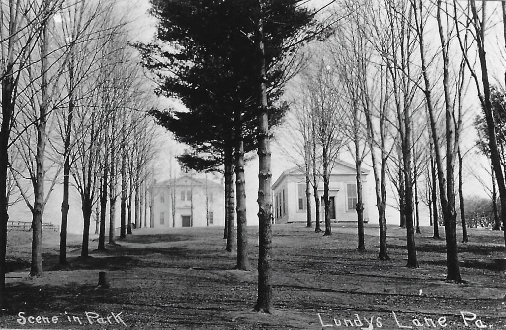 This early 20th century postcard shows Wellsburg Park and the Little Church on the Hill (1855 – right, still standing) in “Lundys Lane, Pa.” This scene is from Route 18 just outside of Albion in western Erie County.