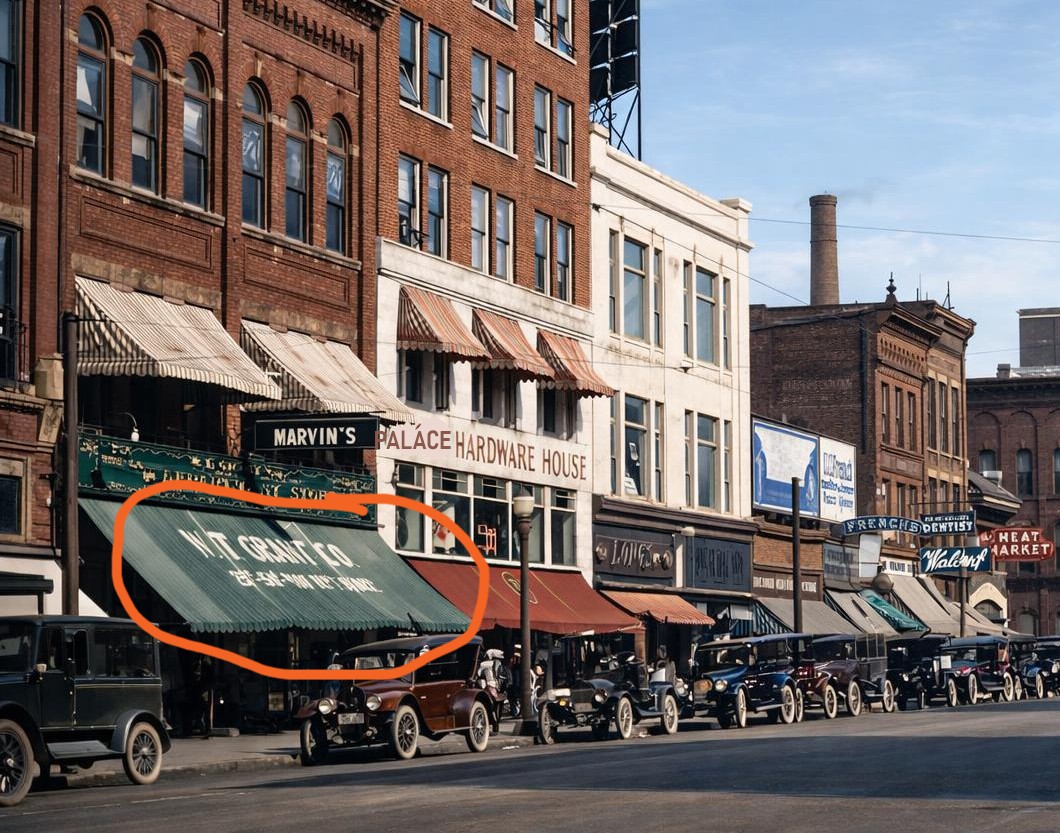 W. T. Grant Co. in Erie, PA was situated in the 900 block of State Street on the East side of the road in the 1930s. This was before the store opened at it’s most memorable location in Erie at 9th and Peach Streets. The cars in this US LOC image are very impressive. Also visible is a “Waldorf” and Palace Hardware.