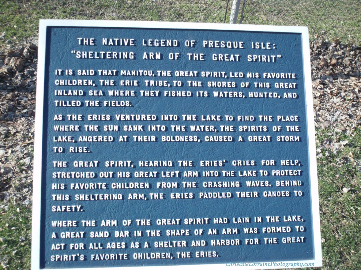 To conclude this piece about the Erie Nation, which was eradicated in the mid 1600s, here is a historical marker that explains the Eries’ story about Presque Isle, which they perceived as the Great Arm. Here’s why: