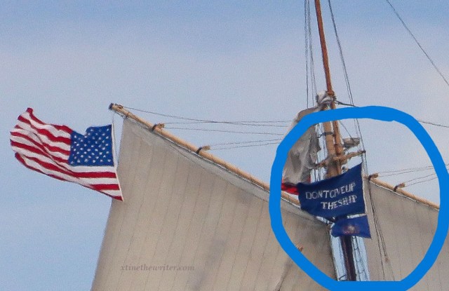 Image capture from August 2025 shows the flags flying aboard the “Lettie G Howard” during the tall ship festival.