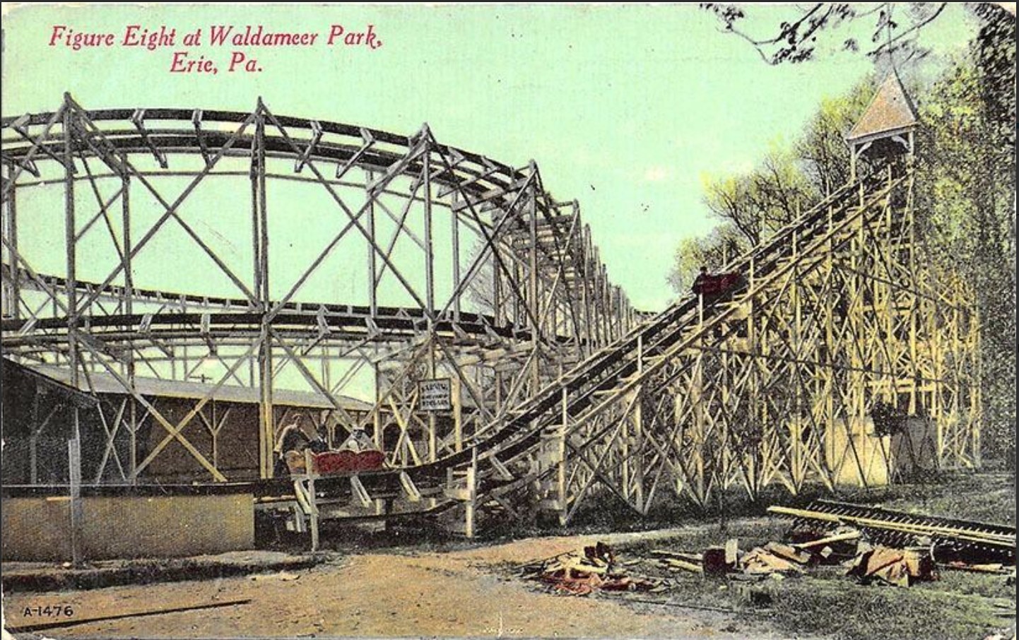 The roller coaster “Figure Eight” at Waldameer in the early 20th Century was featured on this postcard. In today’s advertising world, it’s hard to imagine any sort of advertising in which debris is included in the picture as in the lower right of this image. ca. 1920s