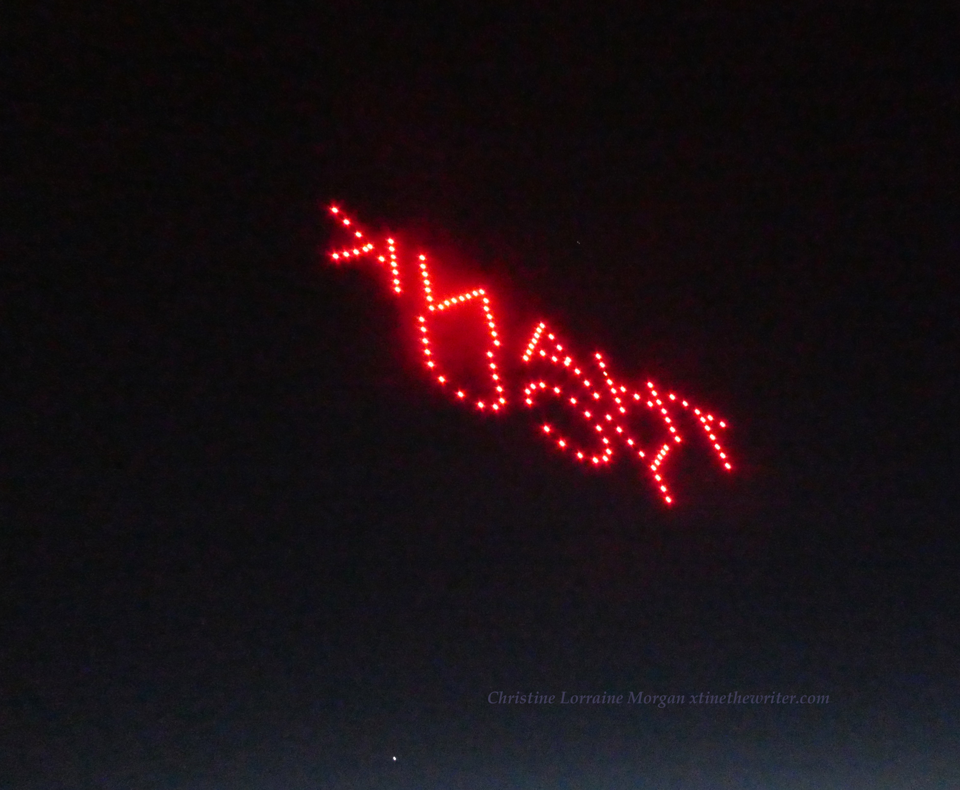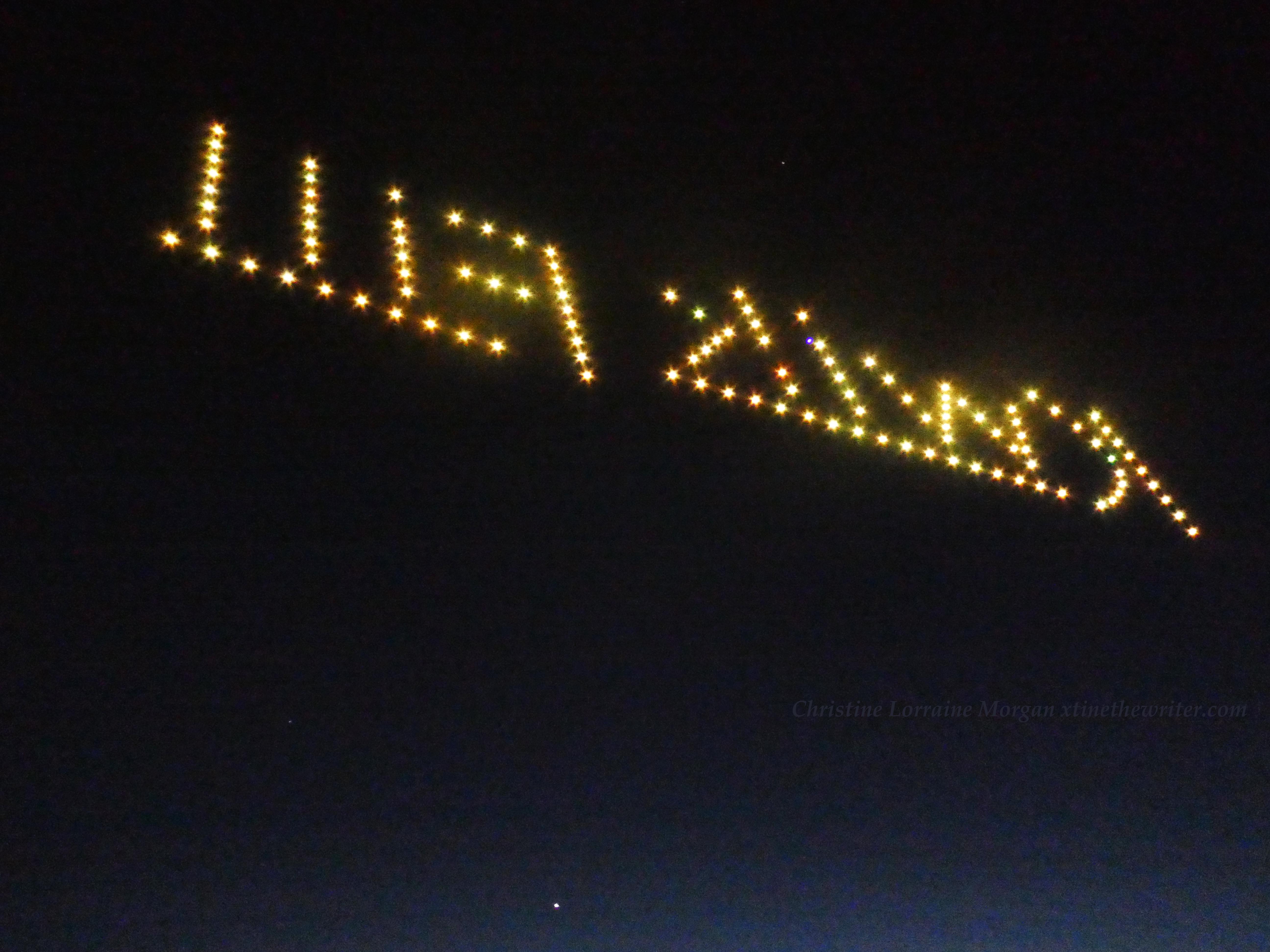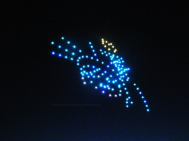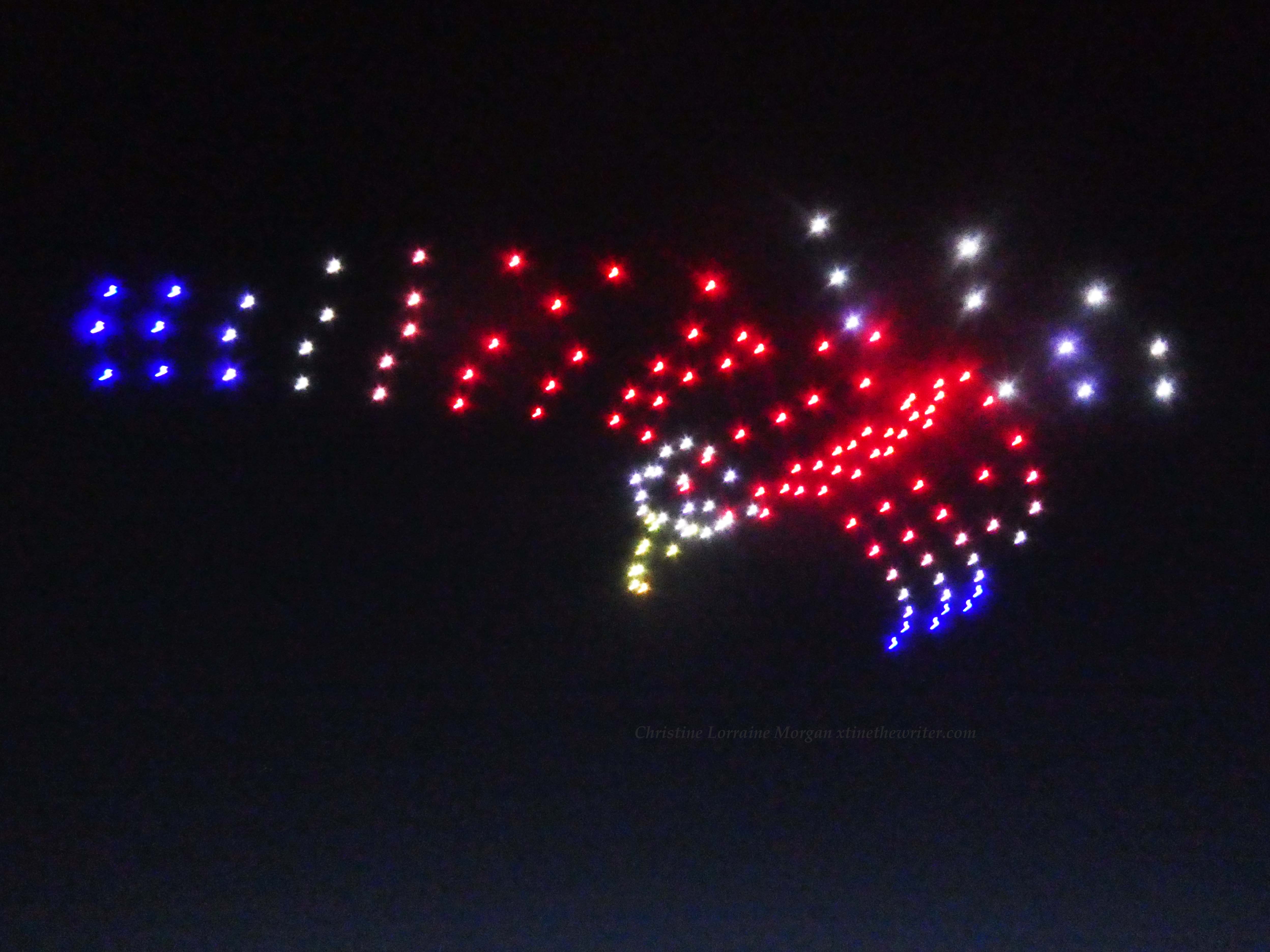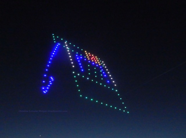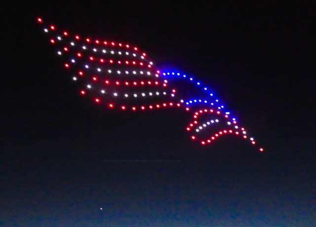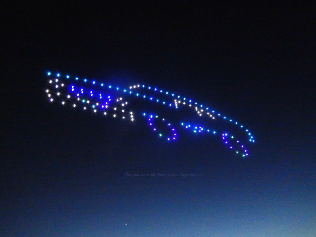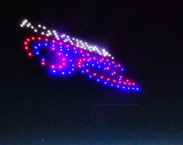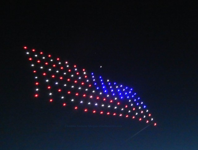 Never saw a drone show before, the audio was like a zillion buzzing bees and very mesmerizing when combined with the colorful visuals. The event was not disclosed to the public, so the crowd of several dozen who wandered onto the scene, like yours truly, were mesmerized by the drones’ performance and surprised at their good luck for finding such an unexpected display of brilliance over the water.